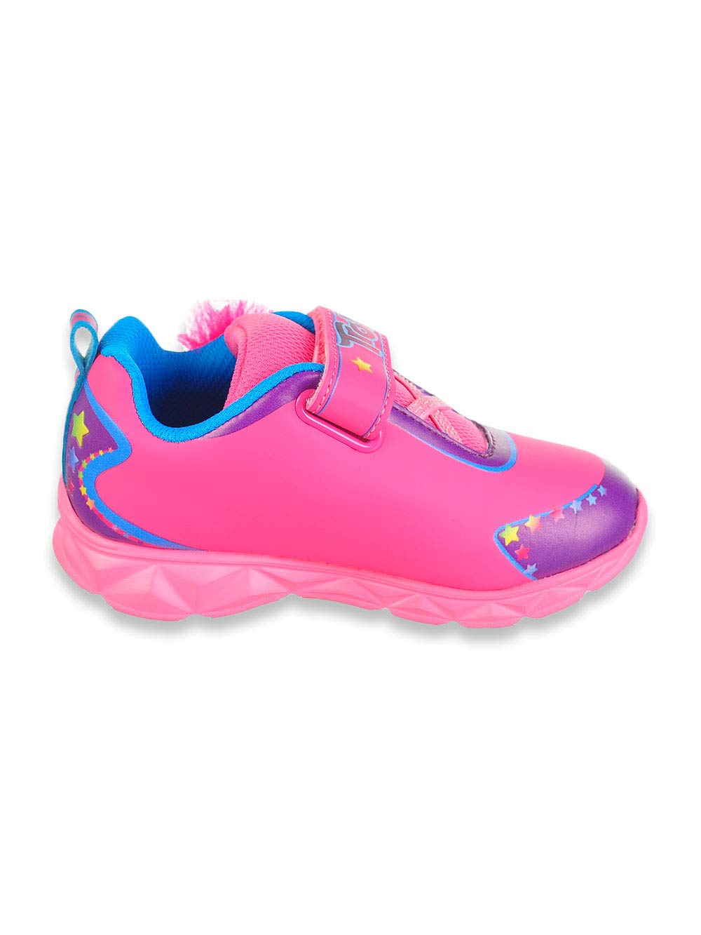 The Favorite Characters Trolls lighted athletic sneakers are sure to put a smile on your little one's face. Made from a man-made upper with Trolls Poppy graphics and elastic laces with a hook-and-loop closure strap. Padded tongue and collar for optimal comfort. Breathable mesh linings and padded man-made insole. Durable man-made outsole.